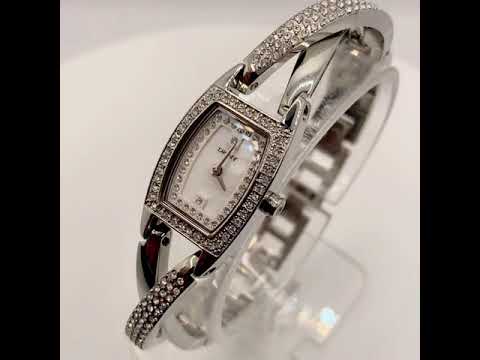 The DKNY ladies watch has a stainless steel bracelet with a crystal-studded bezel and strap. The face is the White mother of pearl and is also studded with crystals.