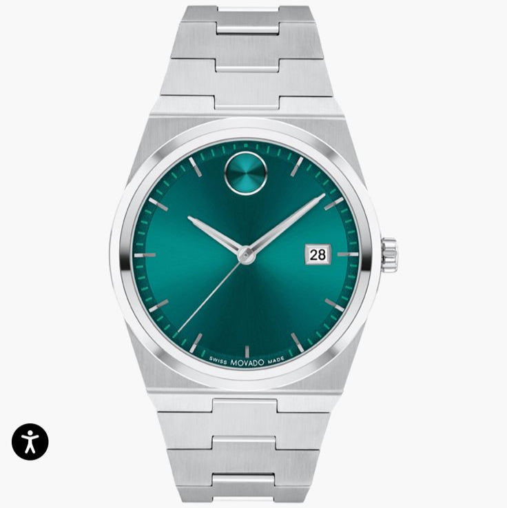 This 40mm watch features a green sunray dial, steel hands, and our signature dot at 12 o'clock.